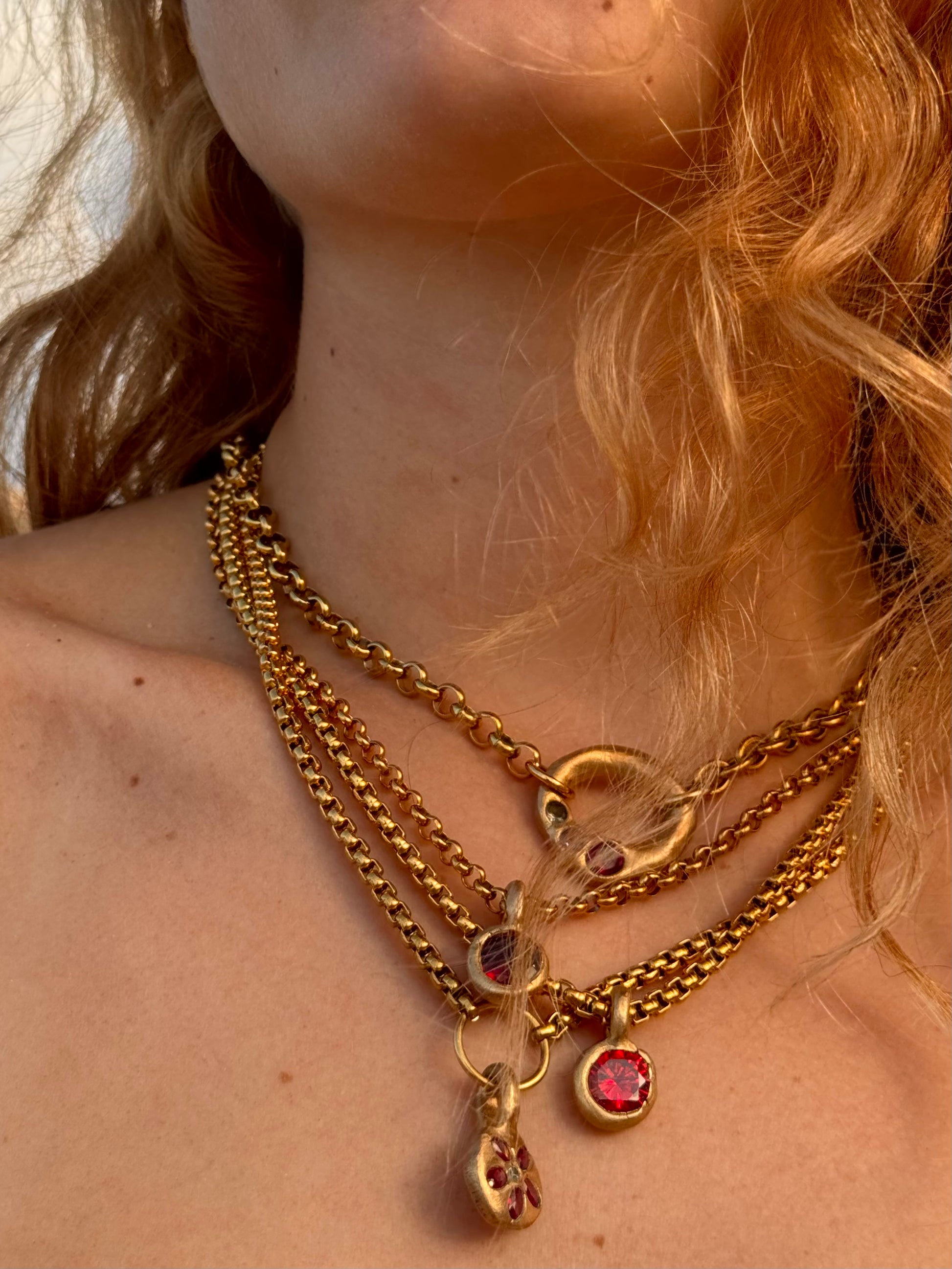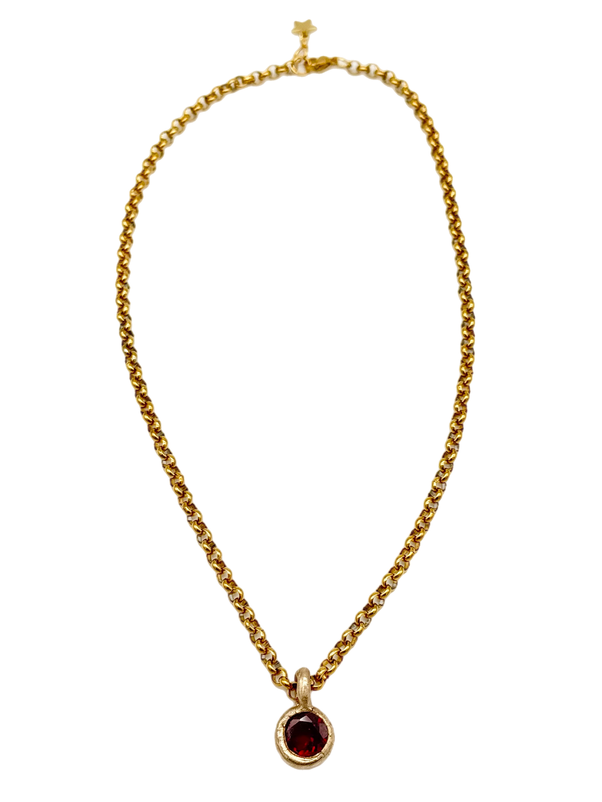 The Caramelo Necklace is a striking handcrafted piece featuring a sculptural bronze pendant paired with a bold gold-plated chain. At its center, a lab-created garnet brings a luminous and vibrant touch, blending the beauty of a gemstone with an eco-conscious approach. Designed for those who appreciate distinctive jewelry with soul, color, and character.