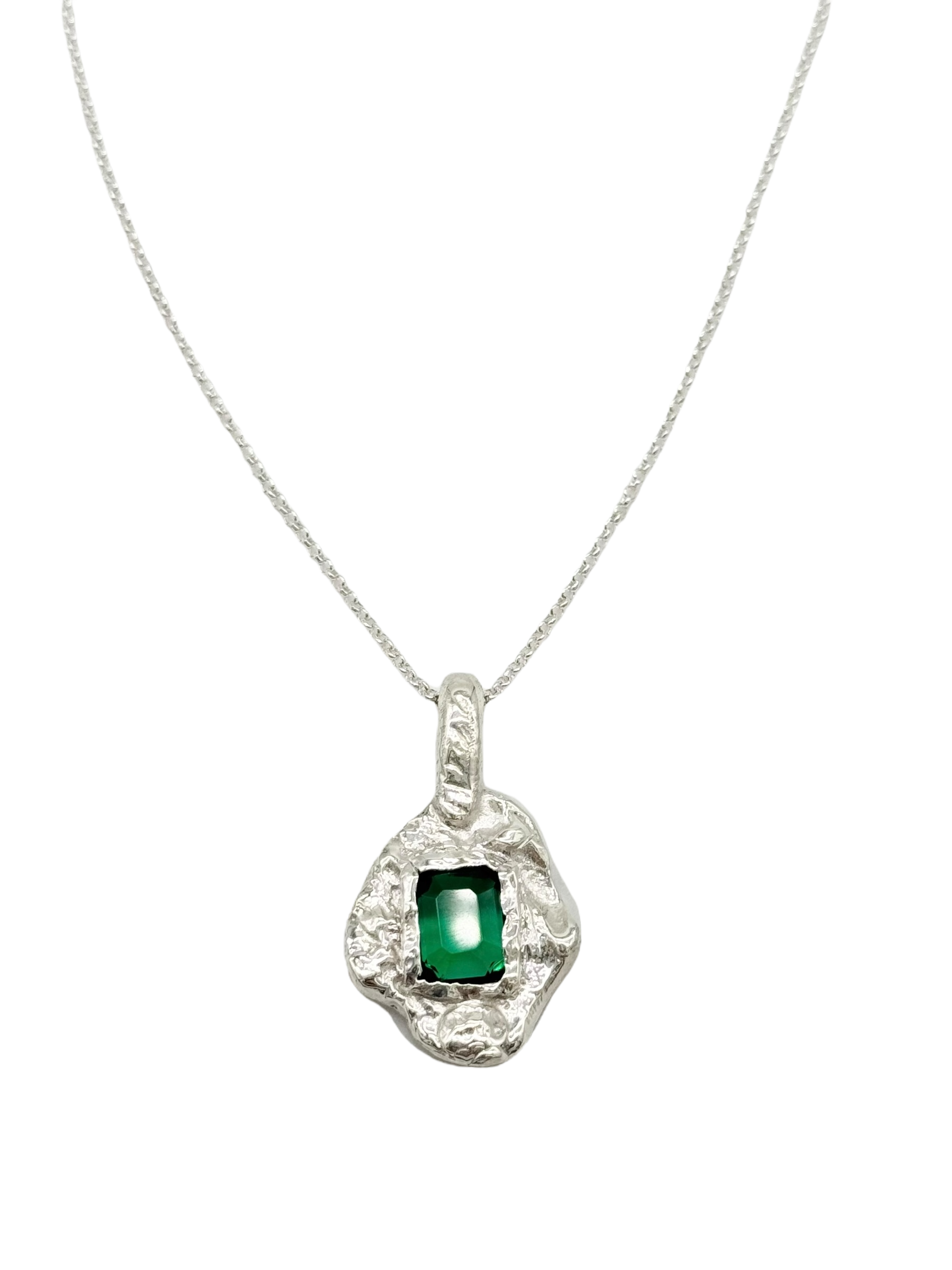 The Esmeralda Necklace is a handcrafted piece made from 950 silver, featuring a beautifully textured design that reflects artisanal craftsmanship. At its center, a vibrant lab-created emerald adds a captivating touch of color and elegance. Its distinctive finish adds depth and charm, making it a standout accessory that brings subtle sophistication to any outfit. Comes with a matching silver chain for a complete, polished look.