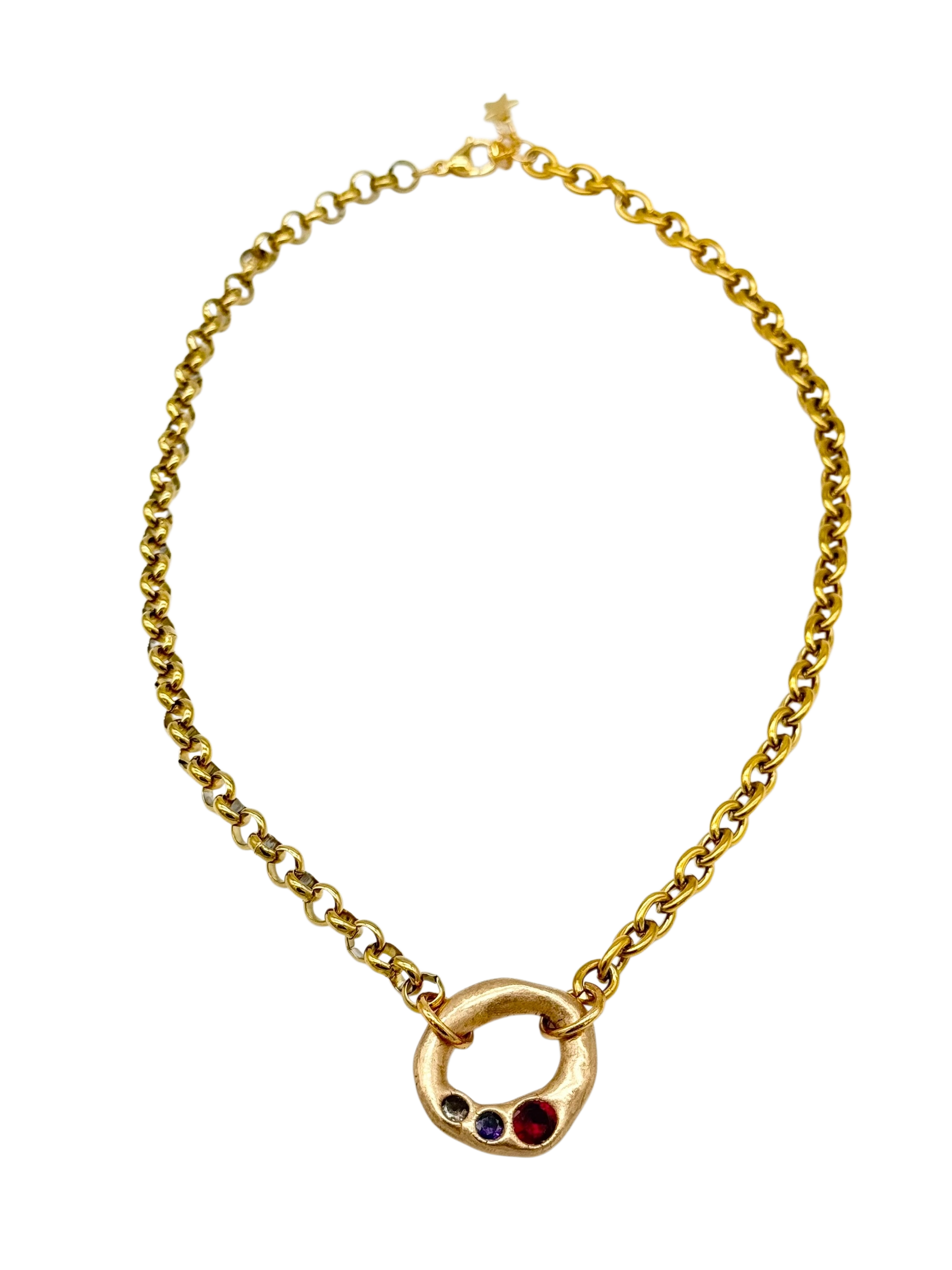 The Circulo Necklace features a bold gold-plated chain and a handcrafted bronze pendant in a circular shape with an open center. Set with lab-created garnet and amethysts, it blends geometric strength with rich, vibrant tones for a striking and elegant statement piece.