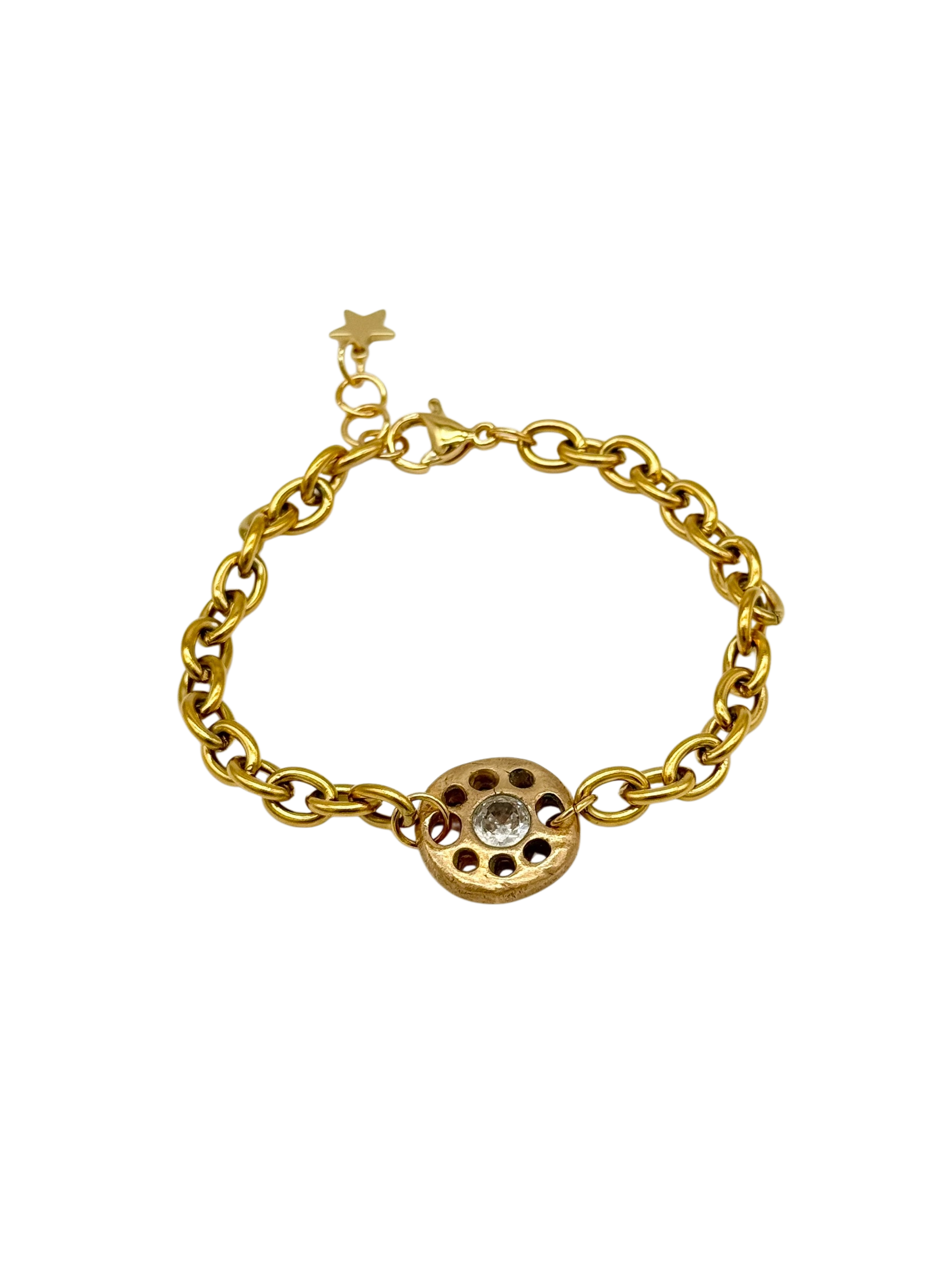 The Coral Bracelet features a chunky gold-plated chain paired with a handcrafted bronze link showcasing a unique textured finish and a radiant lab-created white gem. This bold piece combines organic detail with luminous elegance, making it a standout addition to any jewelry collection.