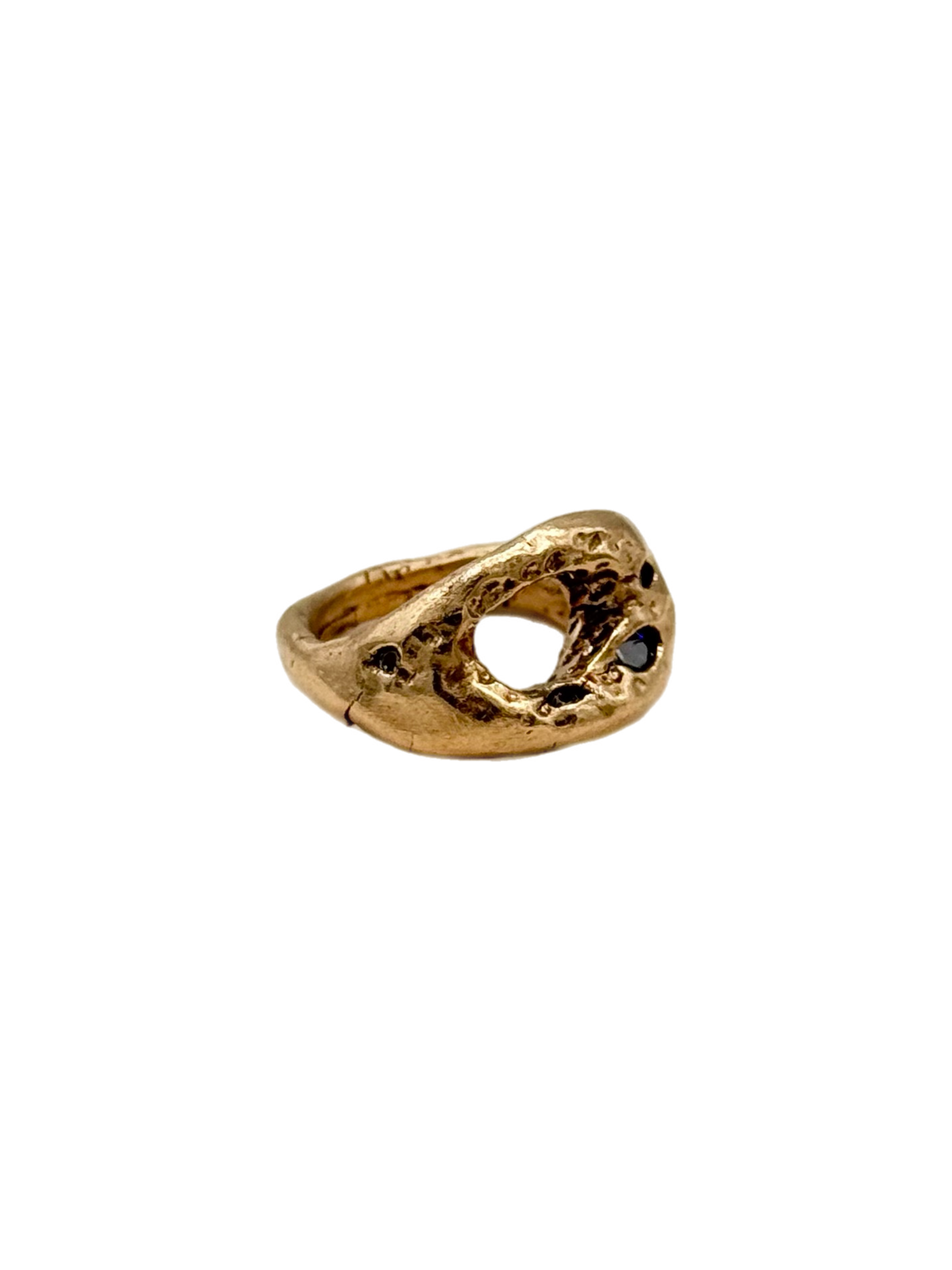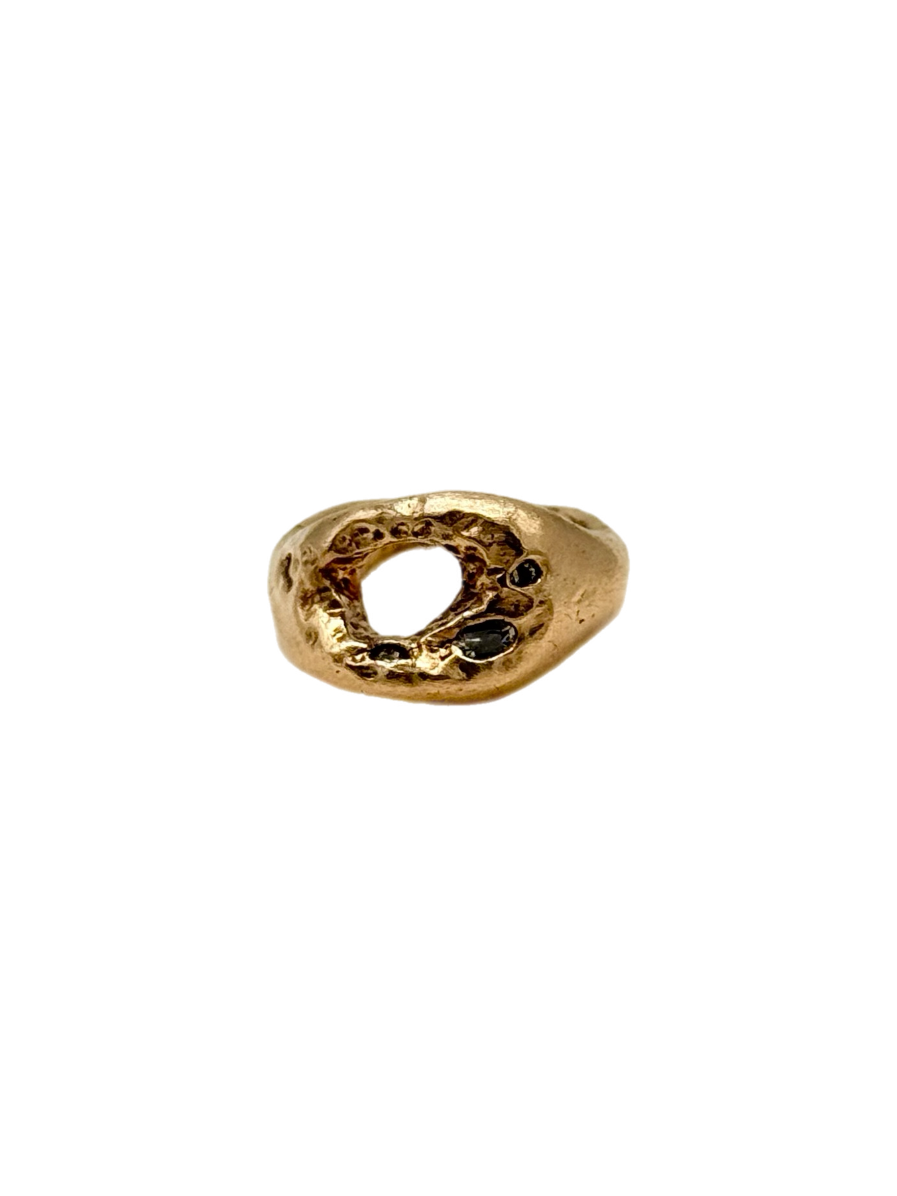 Meet the Crater Ring, handmade in bronze and adorned with white-greyish gems that catch the light with subtle sparkle. At its center lies an open hole, giving the piece a raw, crater-like look — as if it were beautifully broken, yet whole in its own unique way.