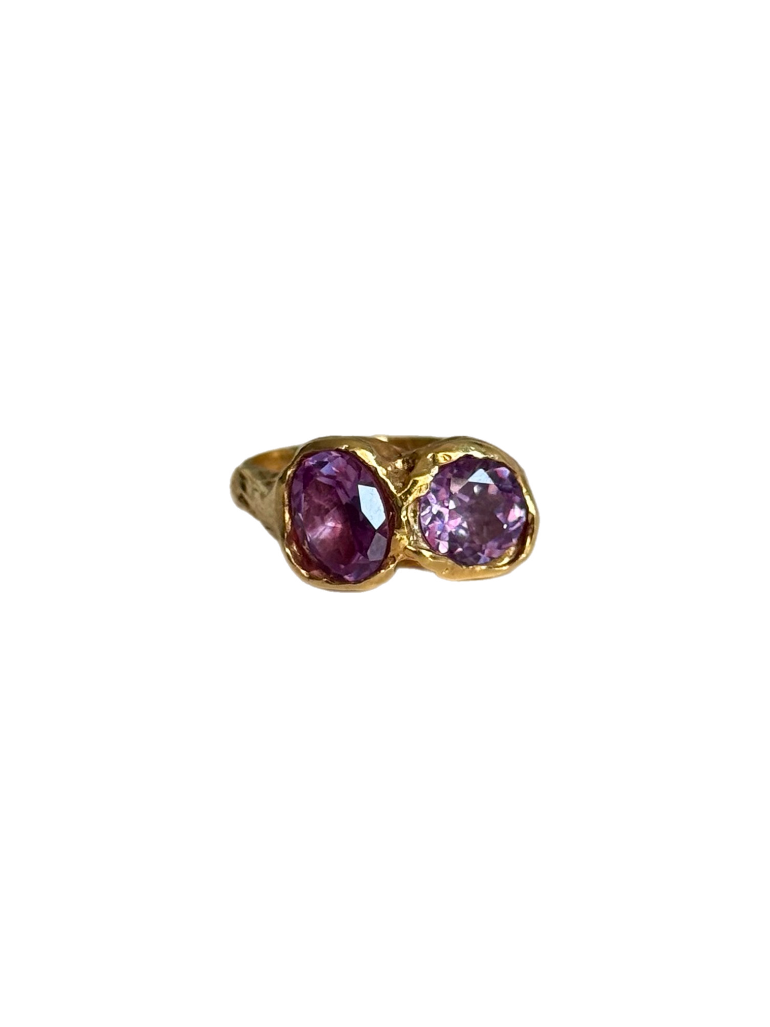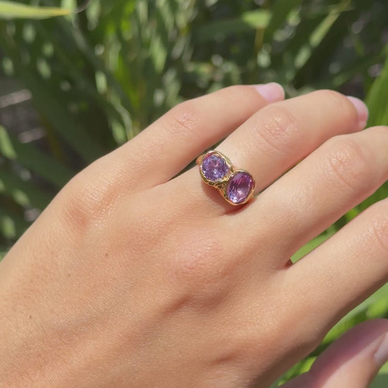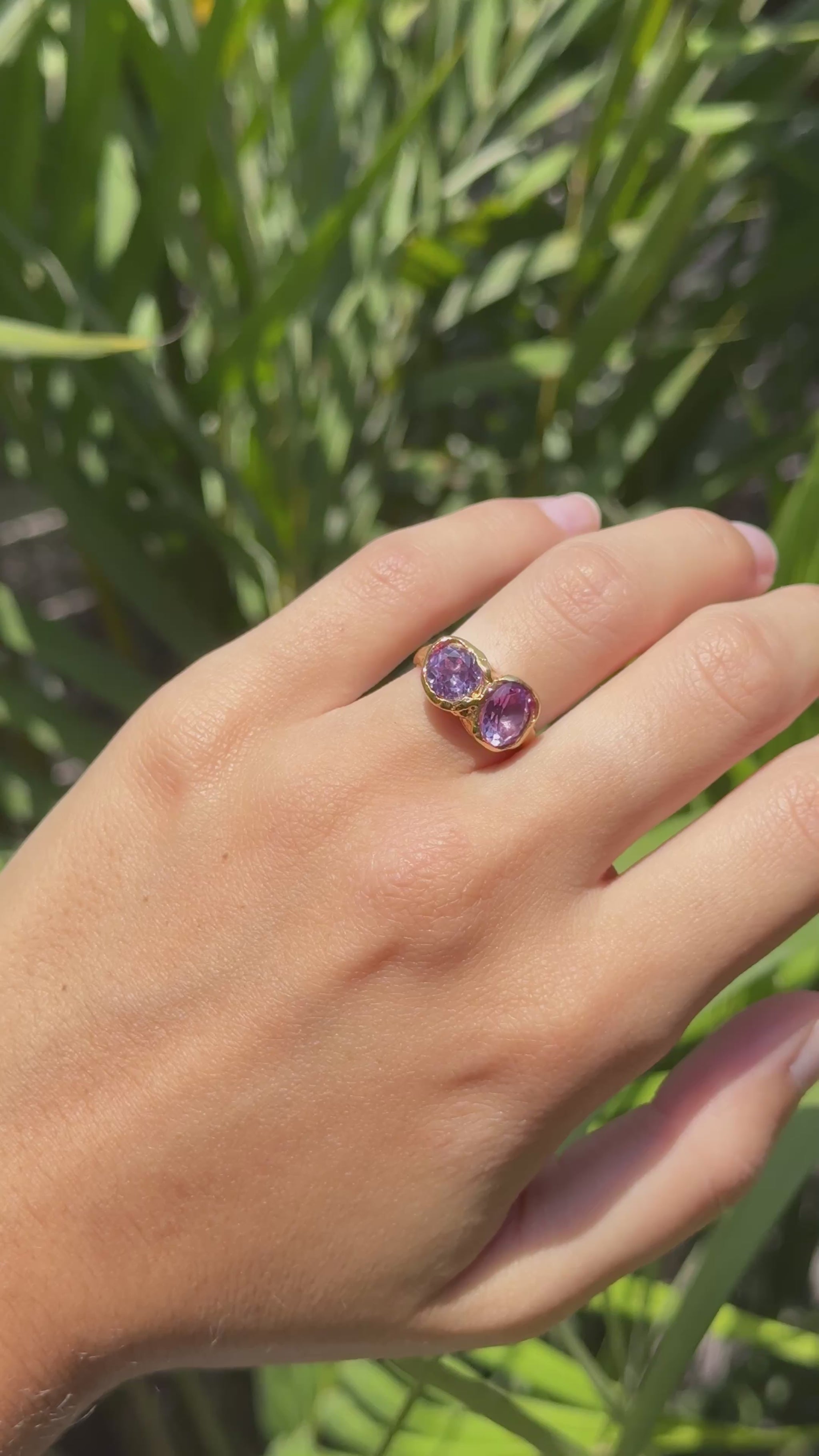 The Eclipse ring is handcrafted in 925 silver with 18k gold vermeil and features two lab-created alexandrites, one oval and one circular, coming together in a balanced design inspired by celestial alignment.