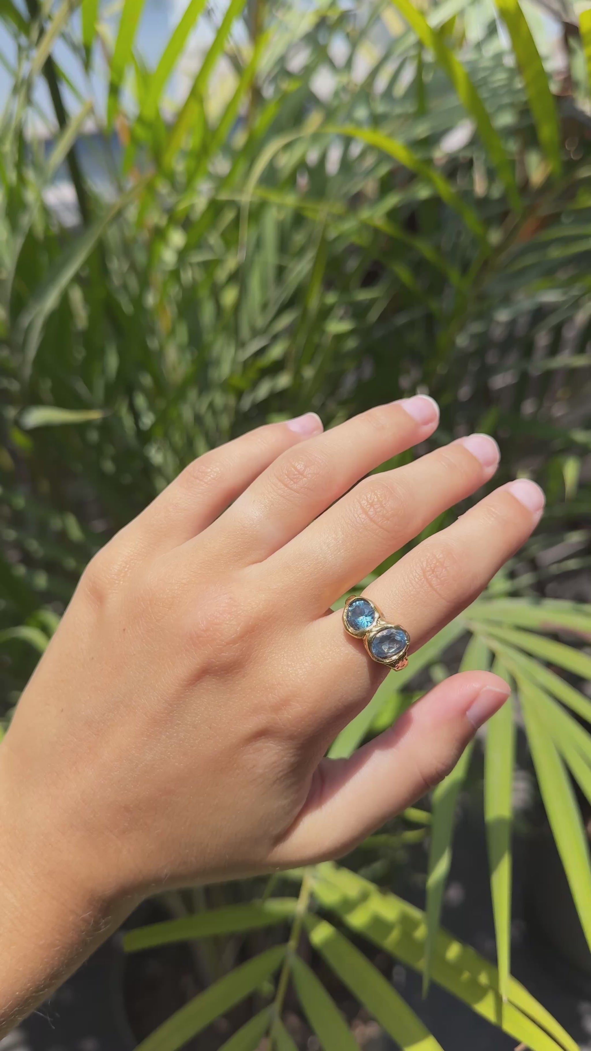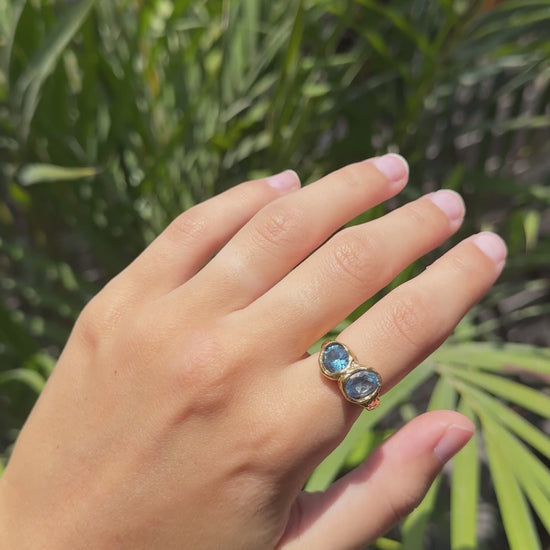 The Eclipse ring is handcrafted in 925 silver with 18k gold vermeil and features two lab-created blue topaz, one oval and one circular, coming together in a balanced design inspired by celestial alignment.