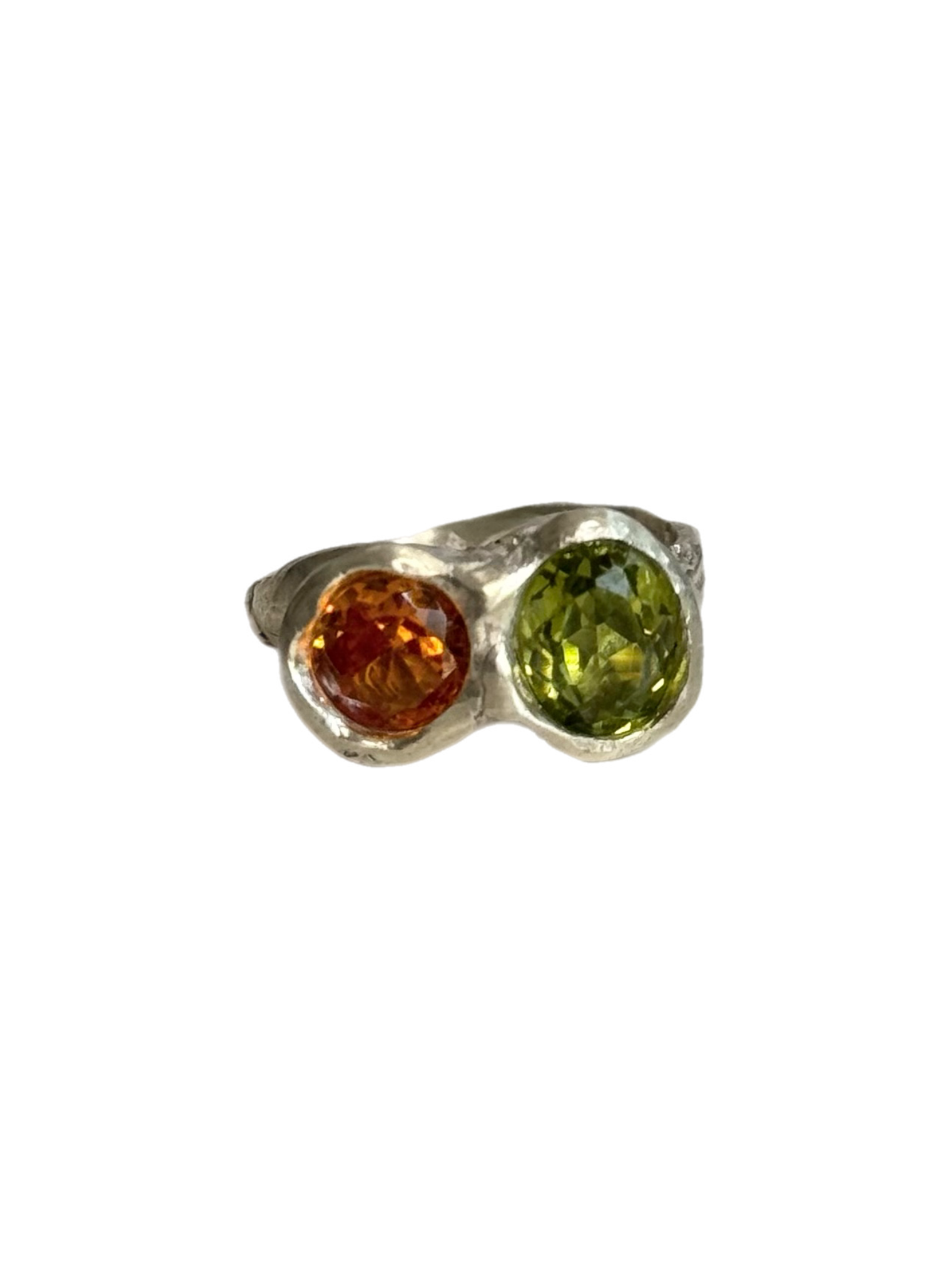 The Eclipse ring is handcrafted in 925 silver with 18k gold vermeil and features a lab-created citrine and peridot, one oval and one circular, brought together in a balanced design inspired by celestial alignment.