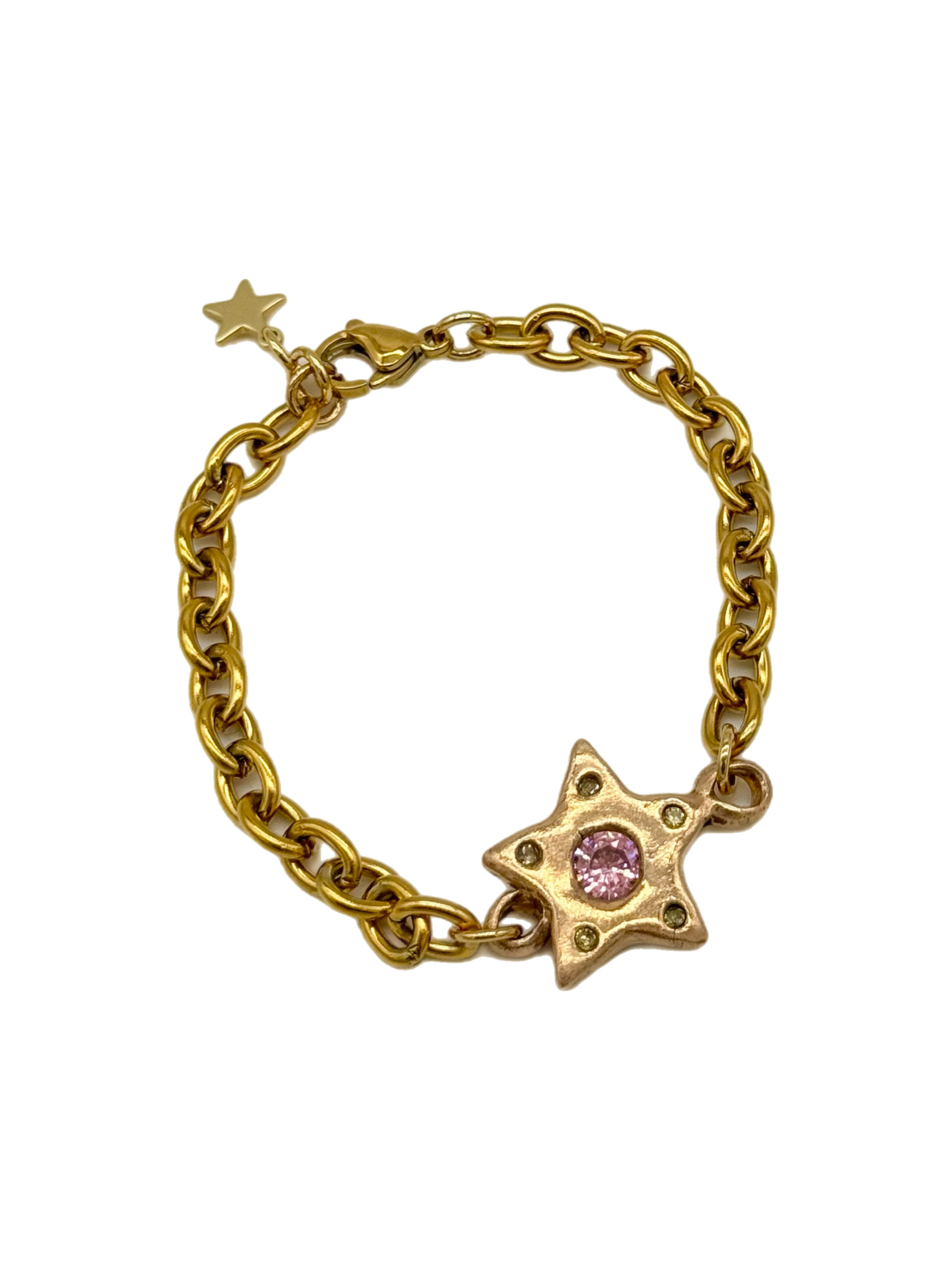 Meet the Estrella XL Bracelet, featuring a handmade bronze star set with lab-created pink quartz and peridots in each point. Finished with a gold-plated chain, it brings together vibrant color and a touch of elegance.