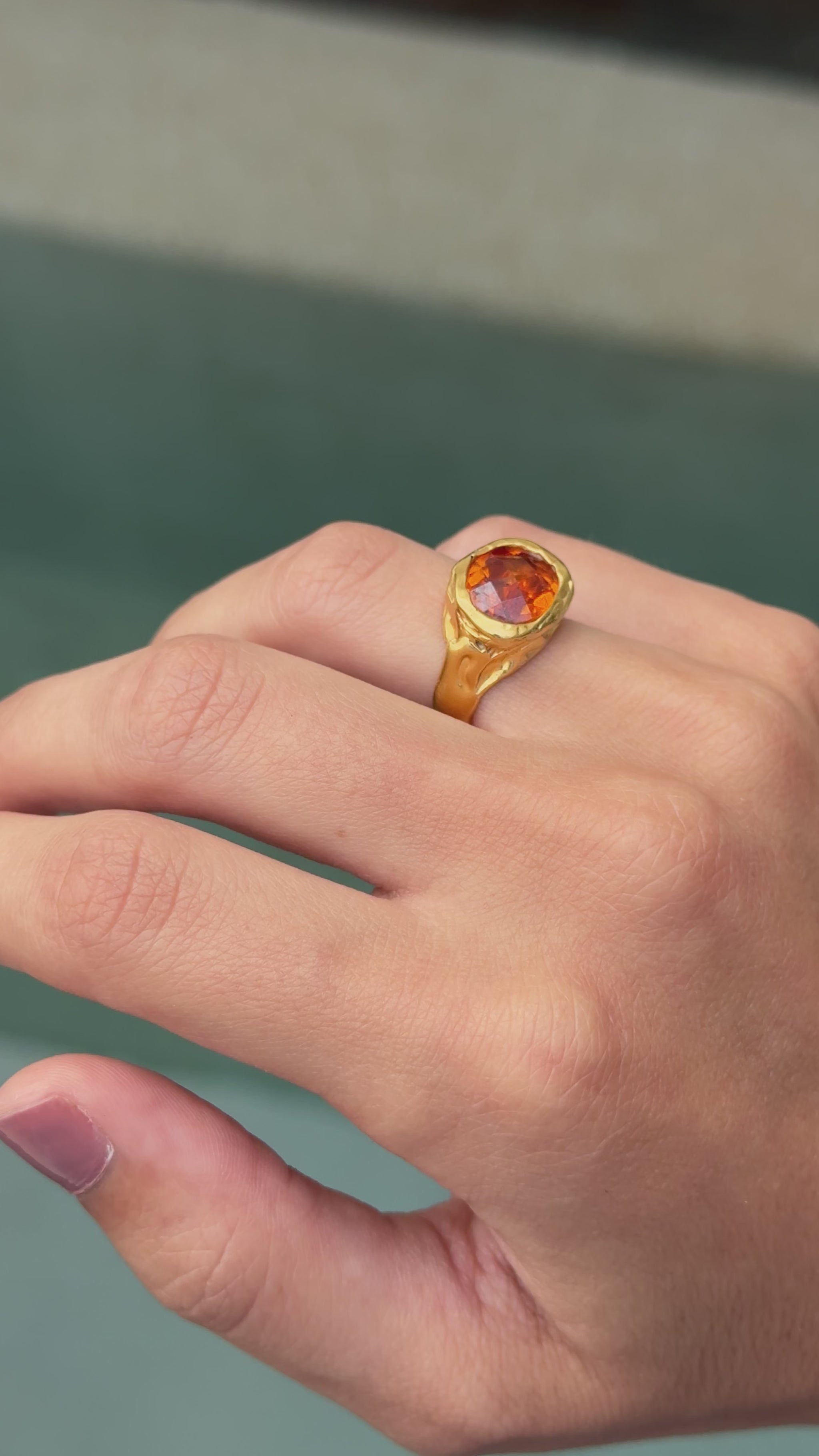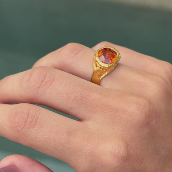 The Fuego Ring is a handmade piece crafted in 925 sterling silver with 18k gold vermeil, featuring a vibrant lab-created grossularite garnet. Its warm, fiery tone brings energy and character to the design, balanced by an artisanal finish.