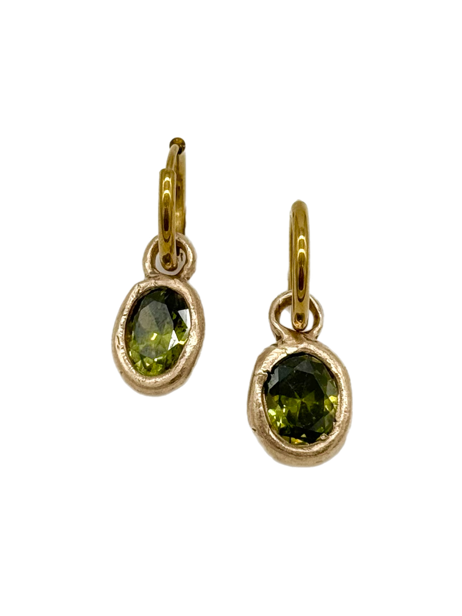 The Hoja Earrings are handcrafted in bronze and feature elegant gold-plated hoops adorned with striking lab-created prasiolites. Inspired by the colors of the sea, their refined design brings a touch of coastal charm and timeless elegance to any look.