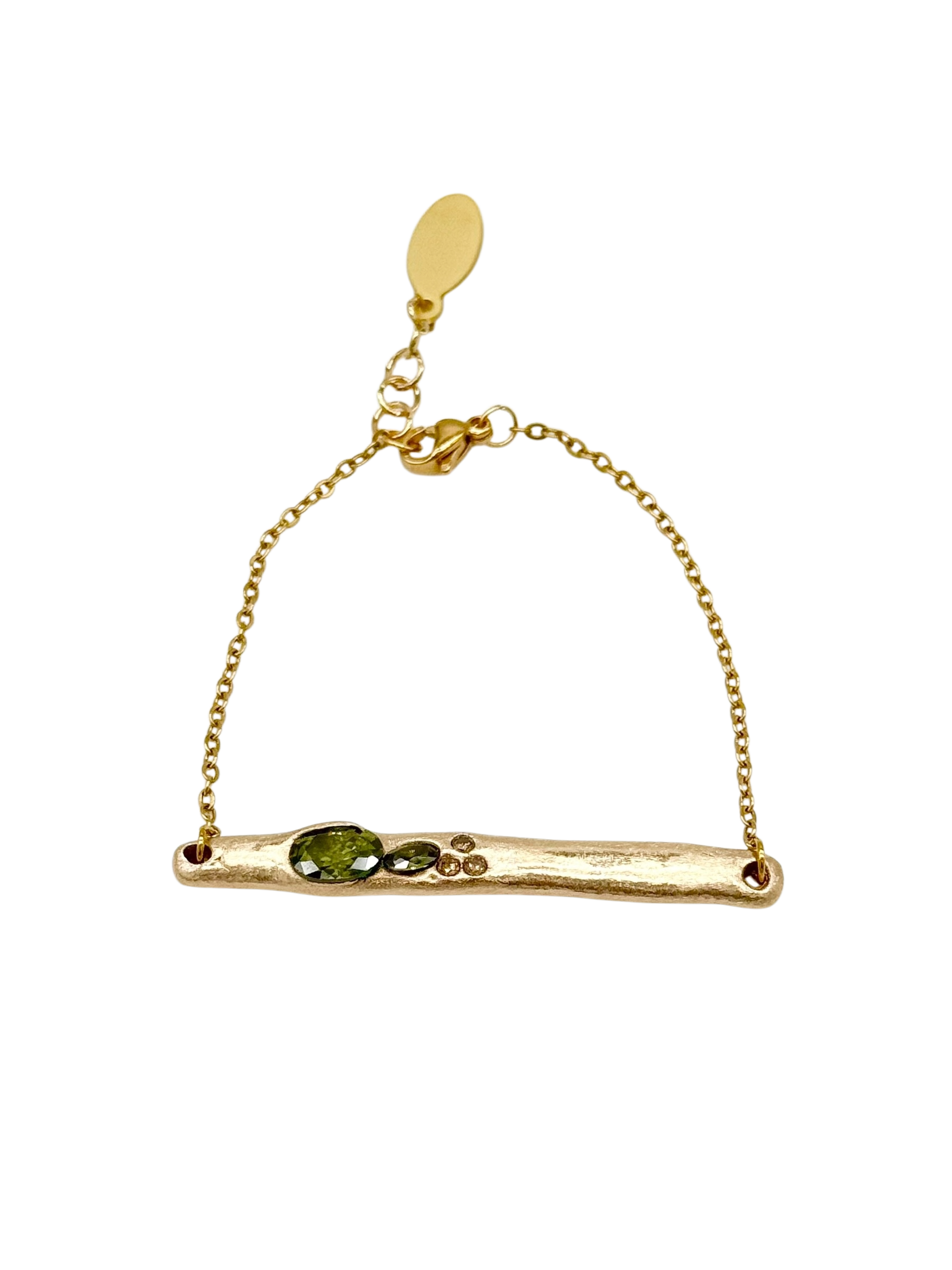 The Horizonte bracelet is a striking blend of strength and lightness, featuring a handcrafted large bronze link paired with soft green lab-created prasiolites and warm champagne quartz. Set on a gold-plated chain, it evokes a serene horizon where earth tones meet golden light—bold, luminous, and intentionally made.