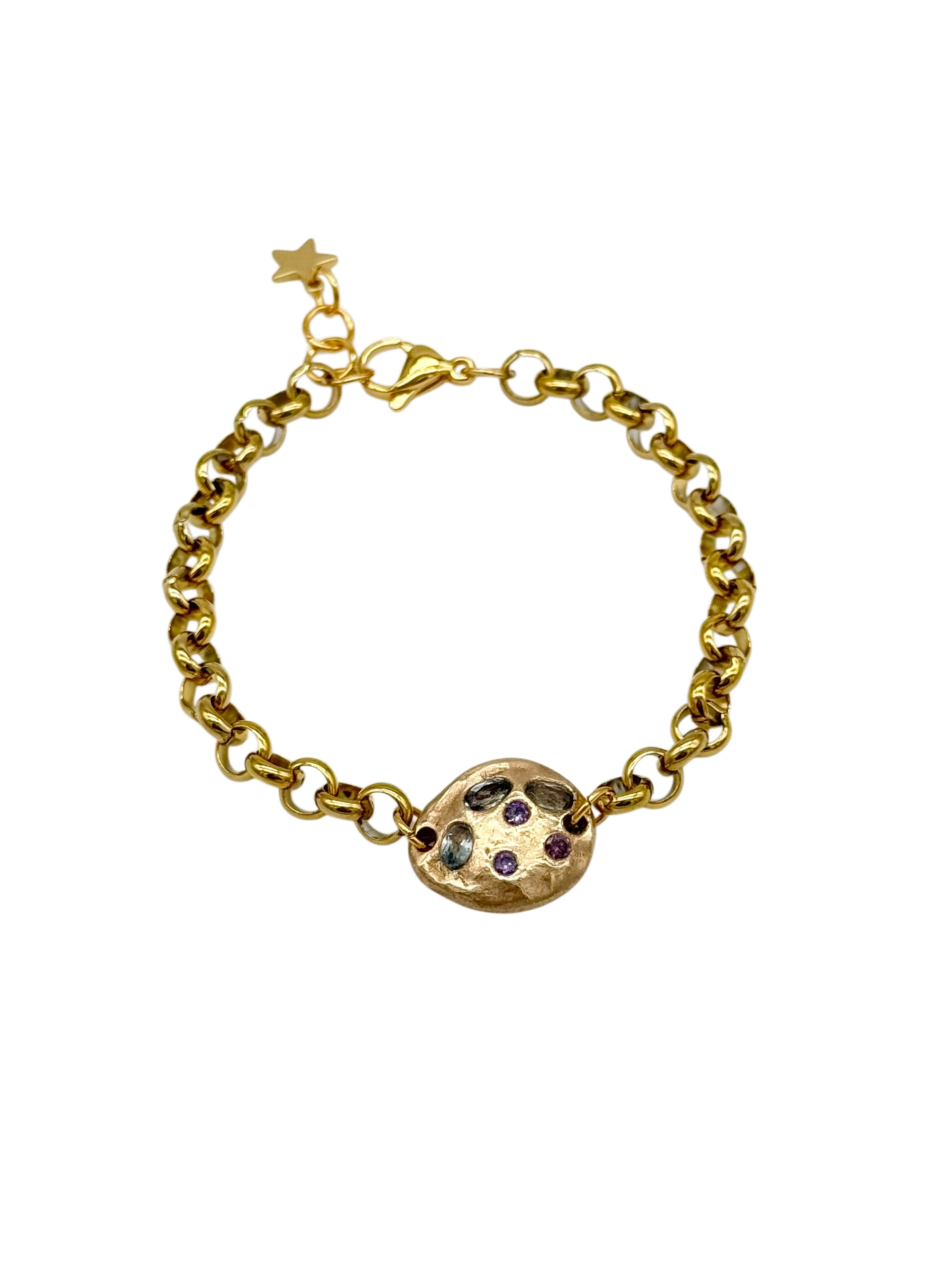 The Lluvia Bracelet is a vibrant and sculptural piece, featuring a chunky gold-plated chain and a handcrafted bronze link adorned with lab-created aquamarines and amethysts. With its soft blues and purples, it evokes the beauty of a summer rain — fresh, unexpected, and full of movement. Bold yet poetic, it's a piece that catches the eye and tells a story.