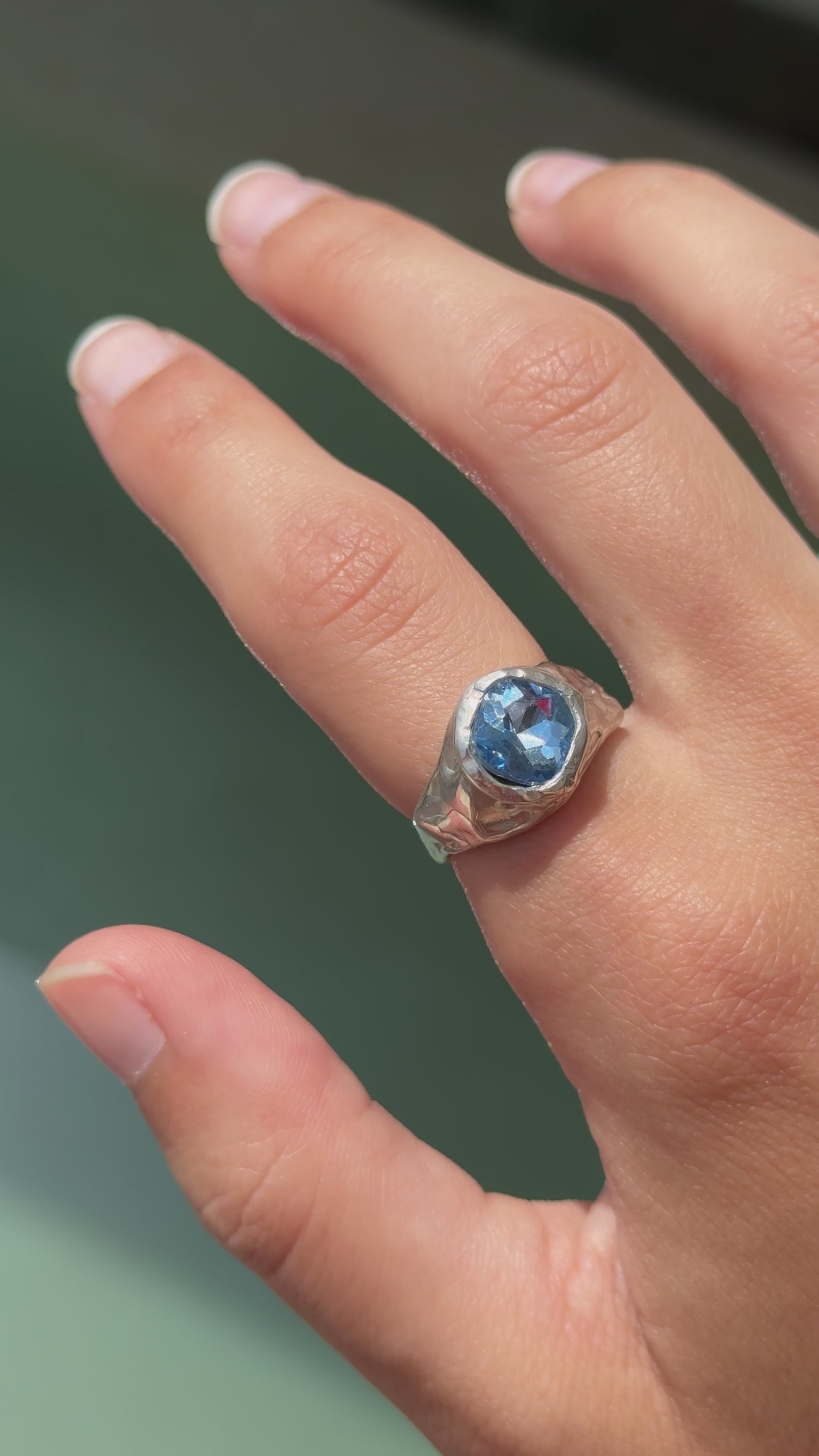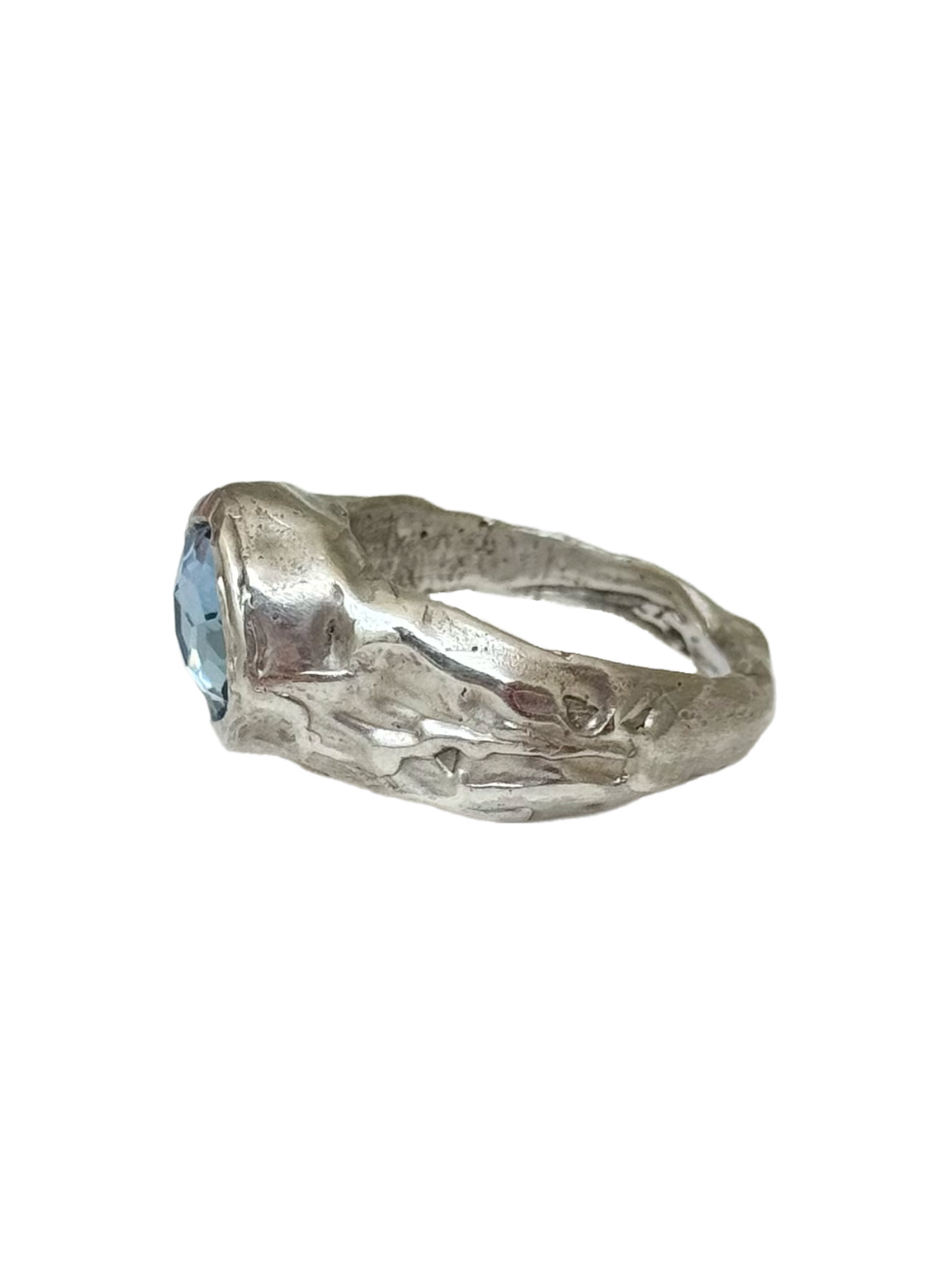 The Mar Ring is a handmade piece crafted in 925 sterling silver, featuring a luminous lab-created blue stone. Inspired by the movement of the sea, its fluid form and soft texture evoke a sense of calm and natural beauty.