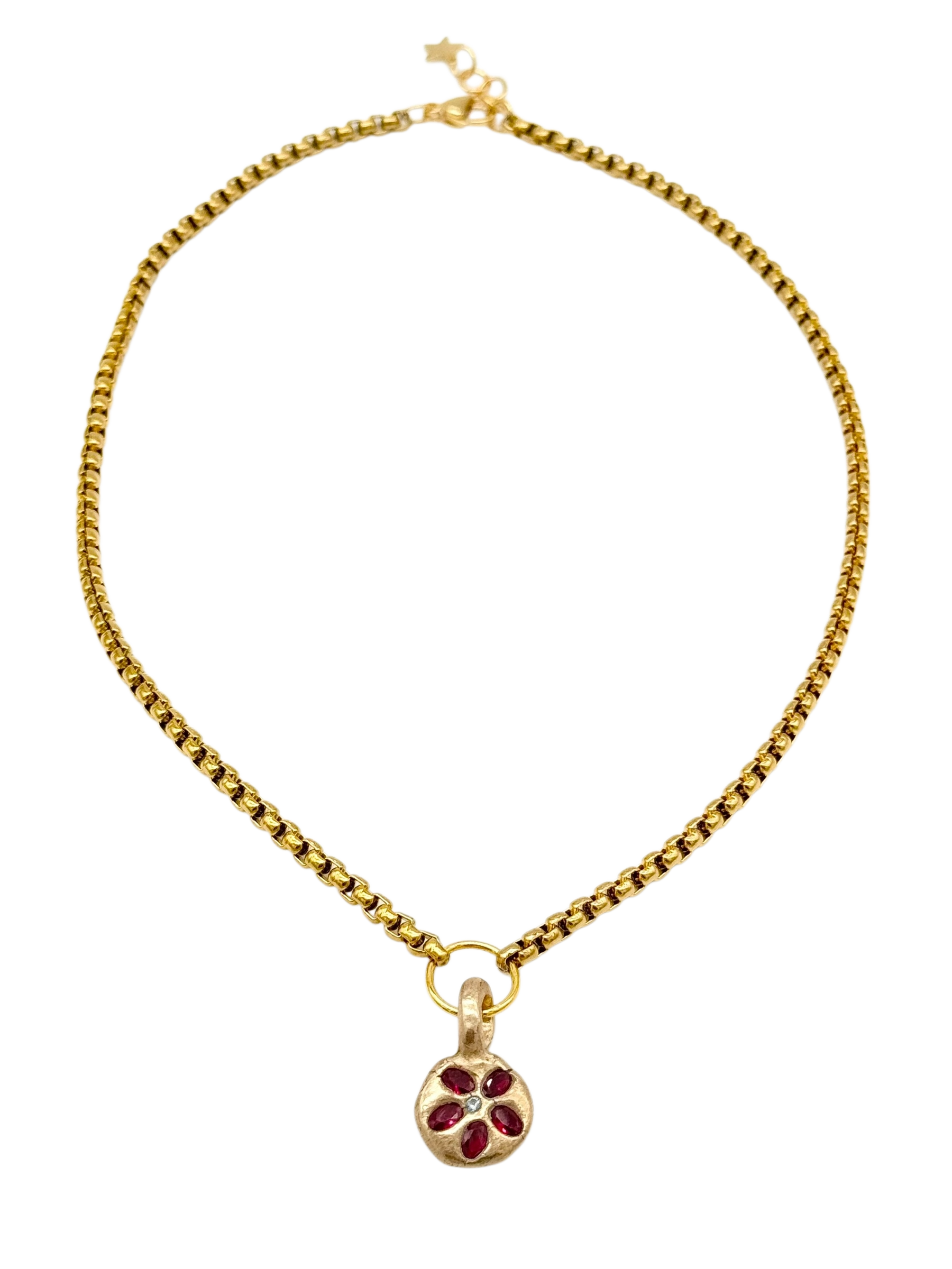 The Naturaleza Necklace is a handcrafted bronze piece adorned with vibrant lab-created garnets. Paired with a bold gold-plated chain, it brings together natural beauty and bold sophistication in one captivating design.