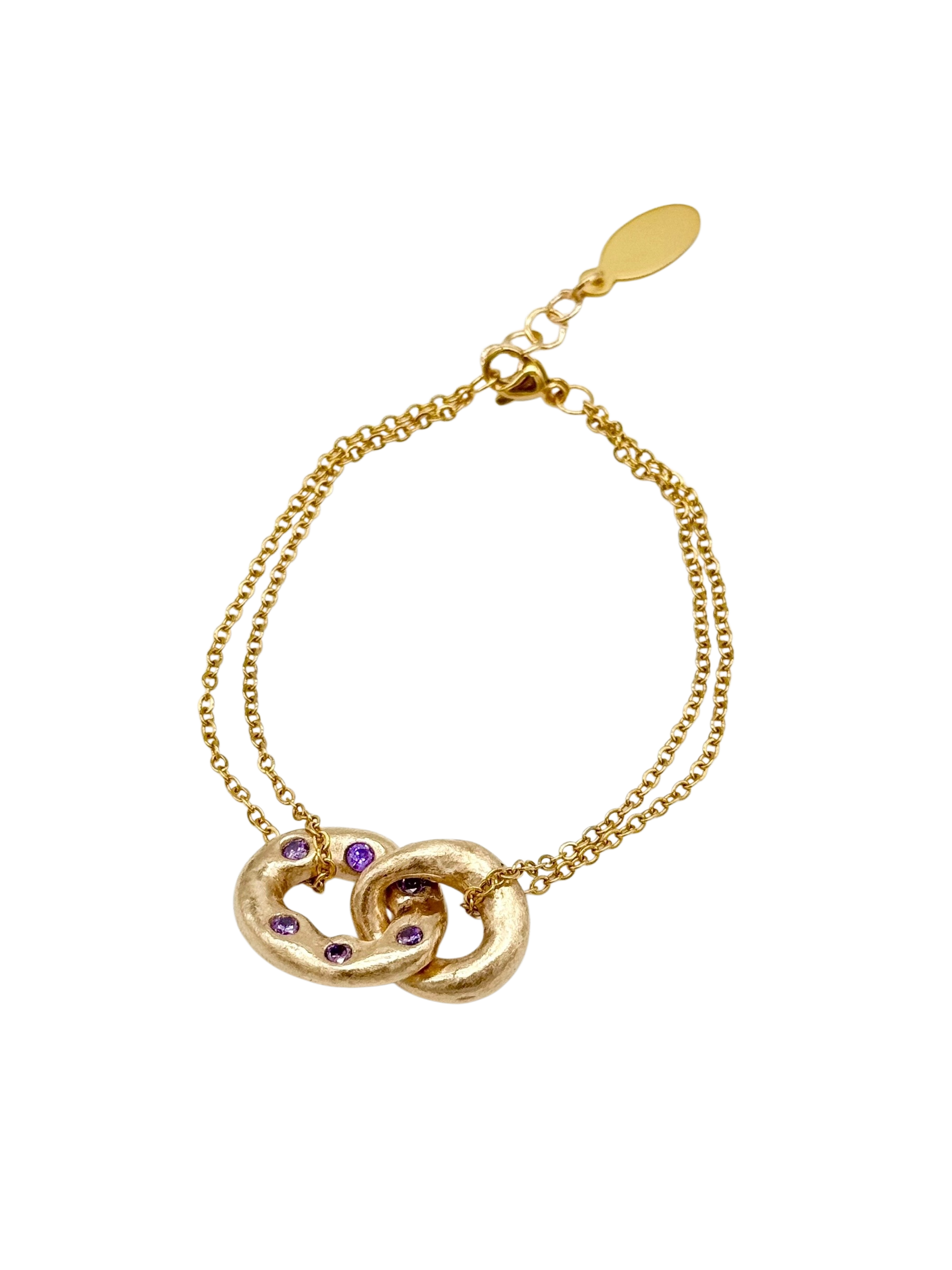 The Nudo bracelet is a bold yet refined statement piece, featuring two oversized links handcrafted in bronze, each adorned with delicate lab-created amethysts. Its gold-plated chain adds a soft glow, balancing the strength of the design with a touch of elegance. A perfect blend of artisanal craftsmanship and sustainable materials.