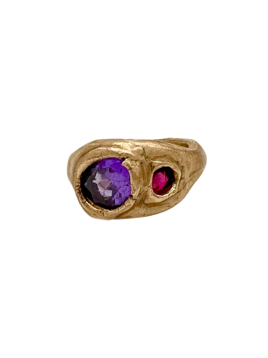 The Par Ring is handmade in bronze and features two lab-created stones: a purple amethyst and a red ruby. It has a big, curved design that stands out and looks great with any outfit.