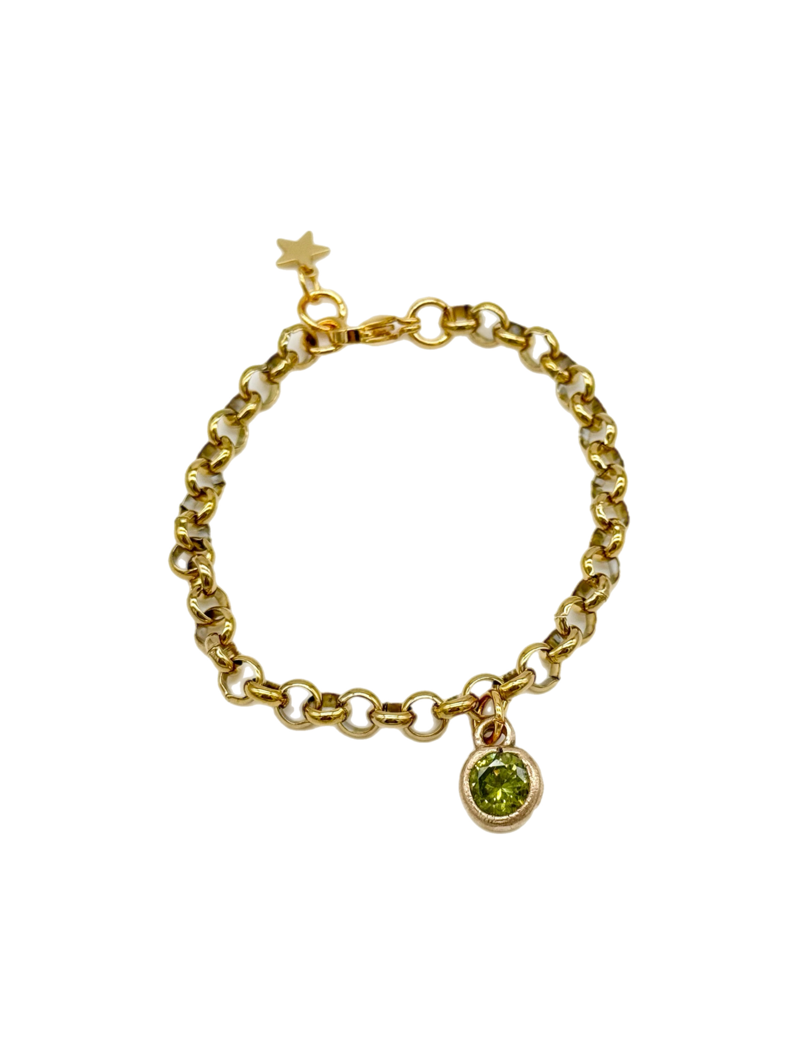 The Punto Bracelet is a bold and expressive piece, featuring a chunky gold-plated chain and a handcrafted bronze pendant set with a luminous lab-created prasiolite. Eye-catching and full of character, it adds a statement-making touch of light and strength to any look.