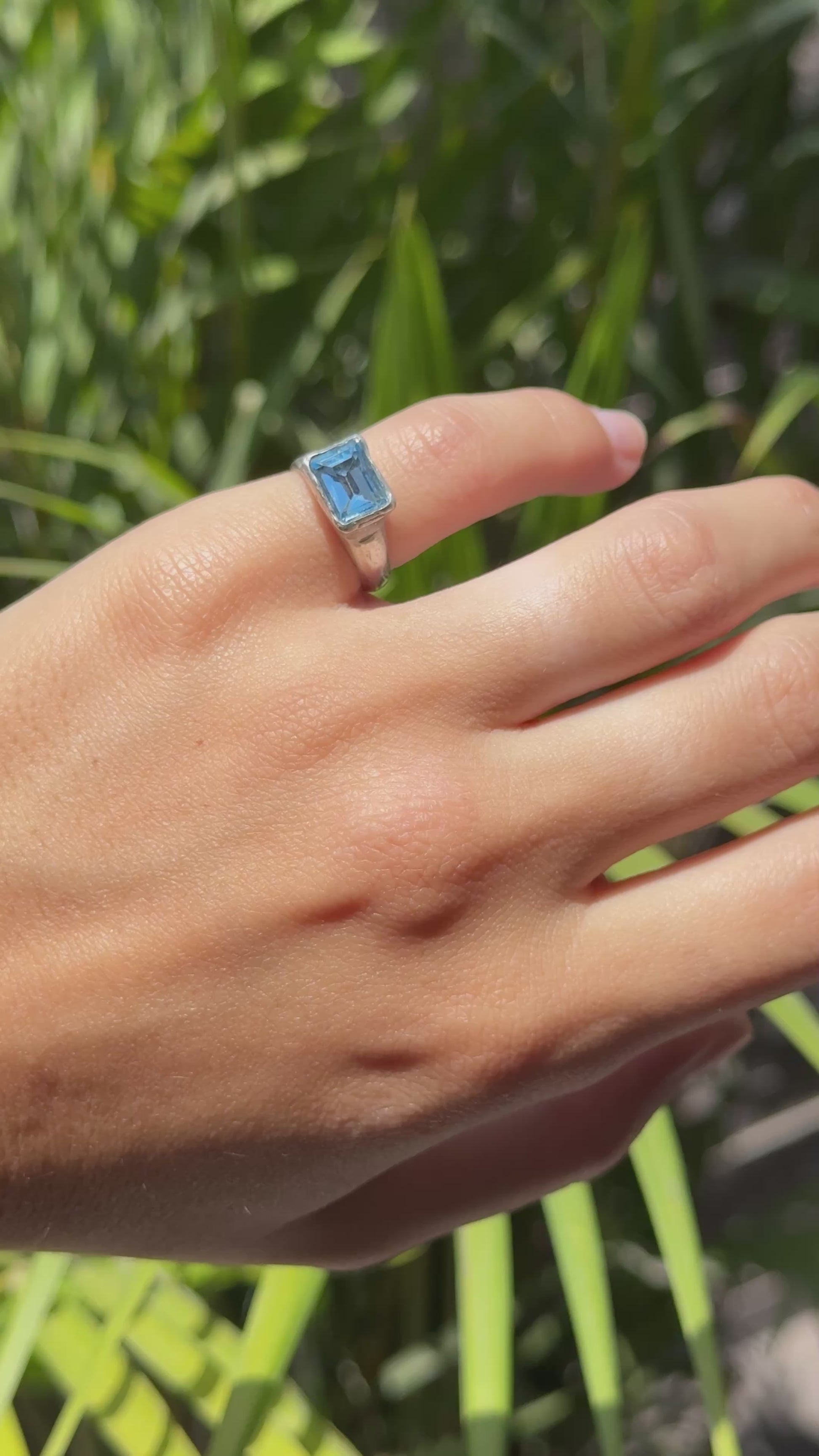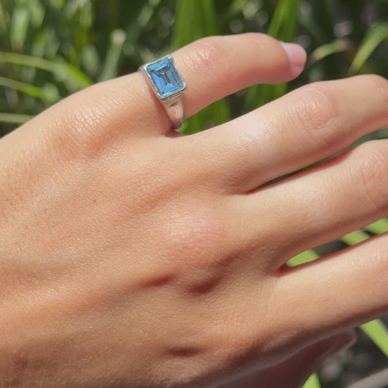 The Rectangulo Pinky Ring is handcrafted in 925 silver and features a sleek rectangular blue Swarovski crystal with a clean, modern edge.