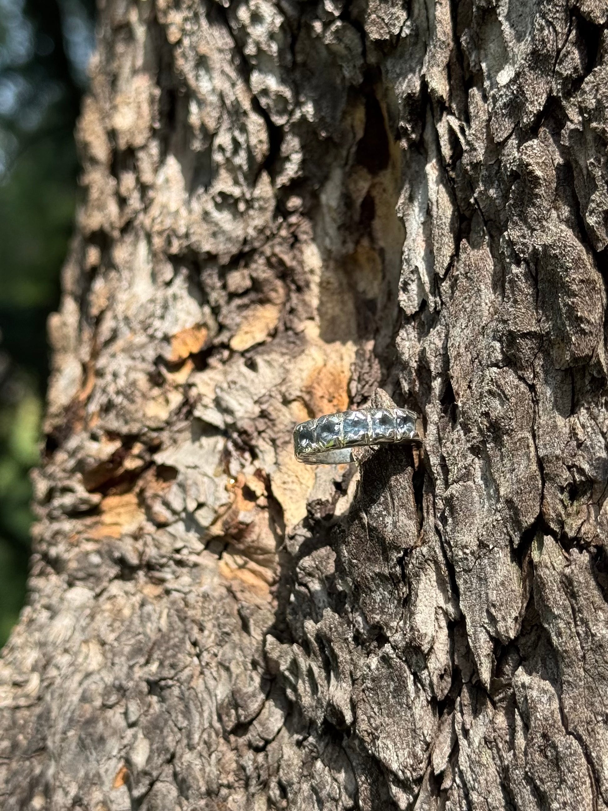 The Rueda Ring is handcrafted in 950 silver and set with five lab-created aquamarines. Its circular composition and cool blue tones evoke movement and balance, creating a bold yet harmonious piece full of light and character.
