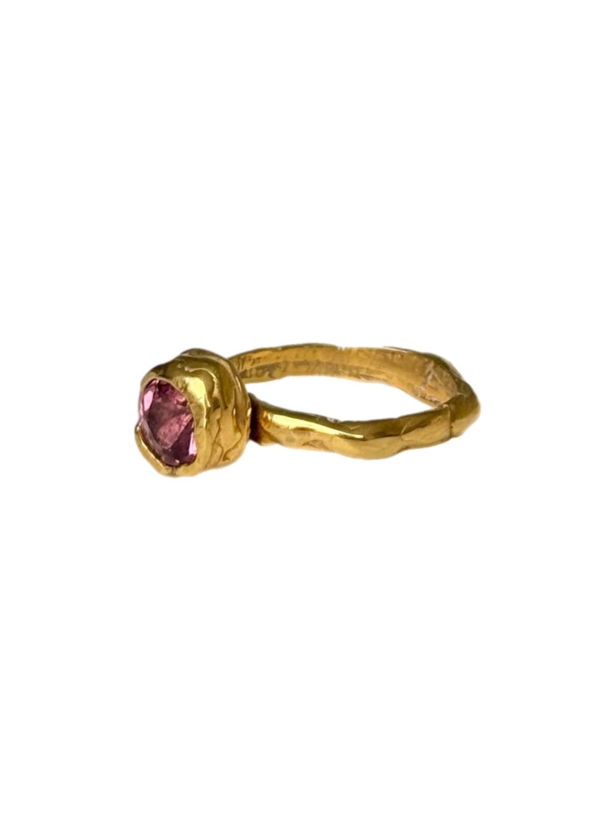 The Sandía Ring is a handmade piece crafted in 925 sterling silver with 18k gold vermeil, featuring a 1.09 ct natural tourmaline in a vibrant watermelon-pink tone. Fresh and luminous, its joyful color is balanced by an artisanal finish.