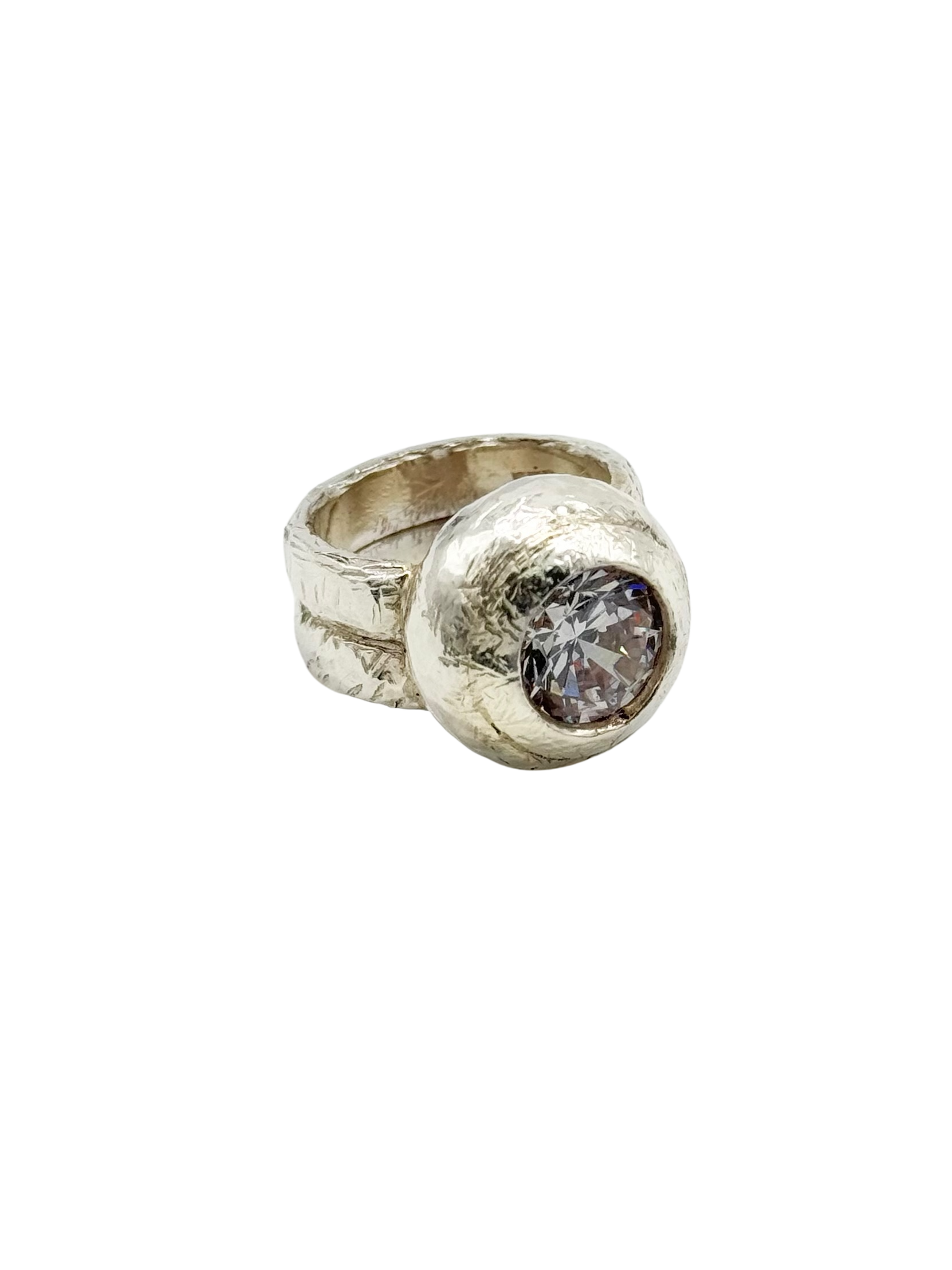 The Saturno Ring is a handmade piece crafted entirely from 950 silver. Inspired by the celestial beauty of Saturn, its sleek design and single eco-friendly cultured gem bring a touch of modern elegance to any look.