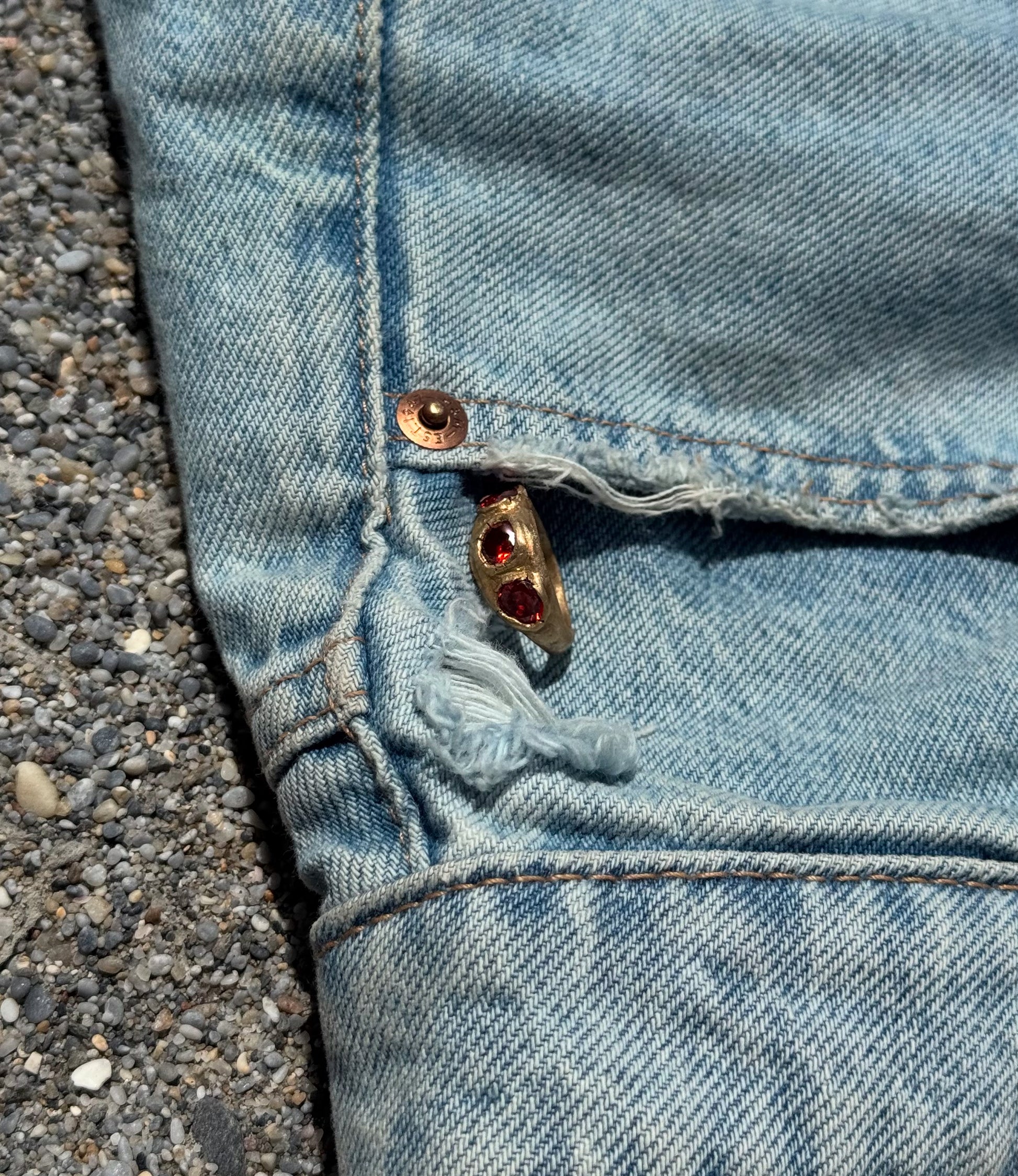The Tres ring is a sculptural piece, handmade in bronze and set with three lab-created rubies. Its gentle contrast and balanced design make it a subtle statement—refined, grounded, and effortlessly distinctive.